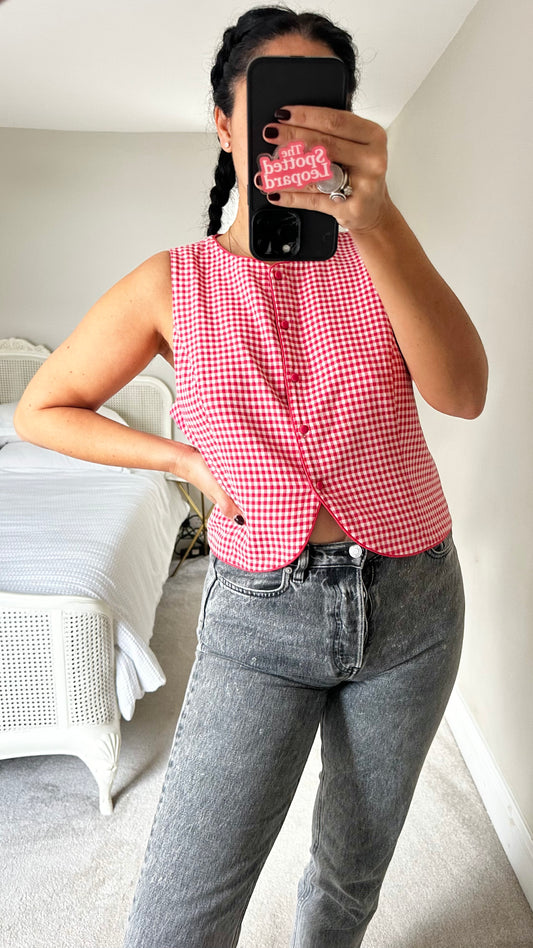 Oliver Bonas red white gingham check waistcoat top button up small medium UK 10 vgc