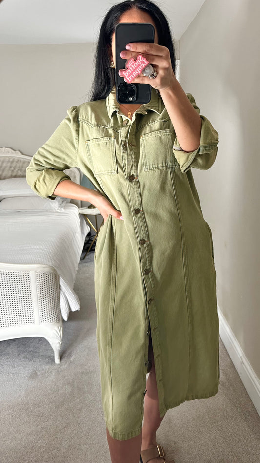 HUSH khaki green button up denim dress midis casual UK 12-14 vgc