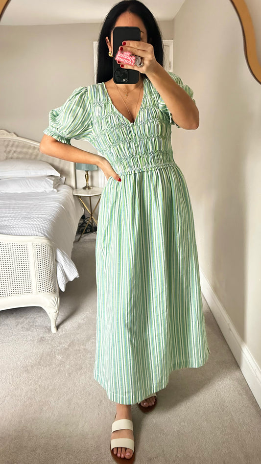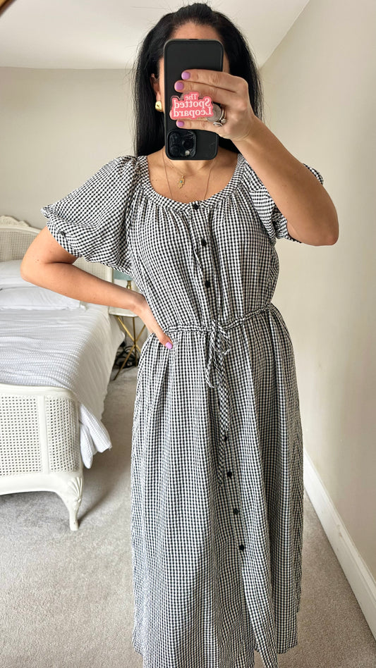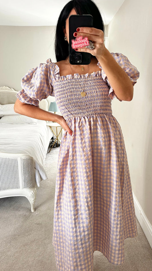 Warehouse lilac beige gingham check midi shirred dress small UK 10 new bnwt