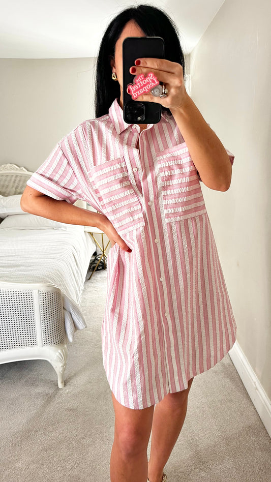 FRNCH pink white stripe mini shirt dress holiday medium UK 12-14 new bnwt