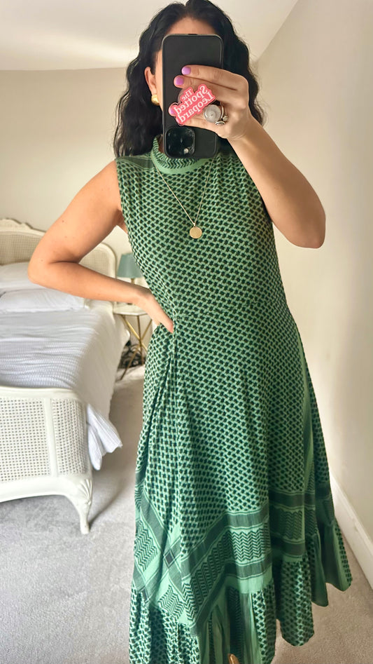 Cecile Copenhagen sage green black khuffiyeh Palestine print midi long dress small UK 10-12 vgc