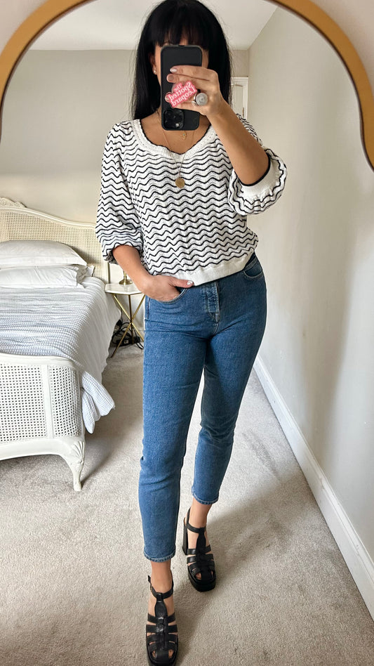Oliver Bonas white black stripe squiggle knitted jumper large UK 14-16 vgc