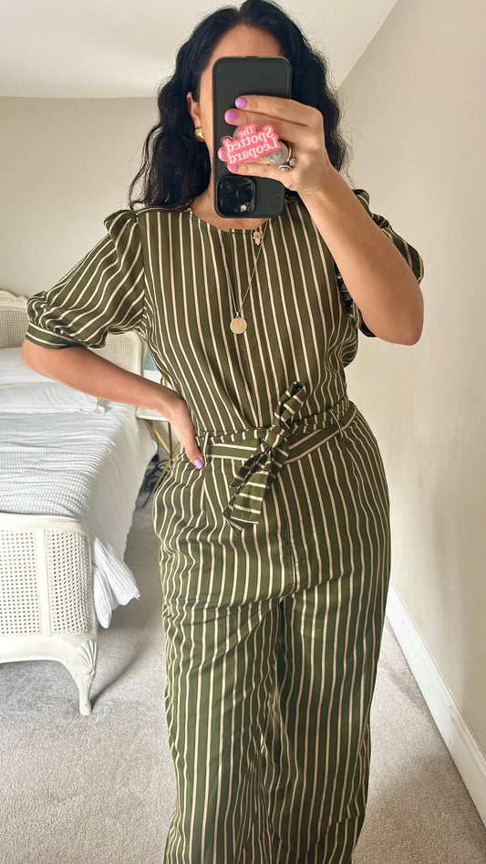 Oliver Bonas khaki olive green cream stripe jumpsuit trousersuit small UK 10 new bnwt