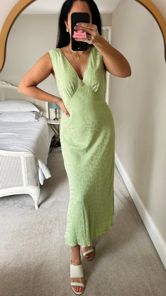 Omnes light green leopard animal print midi maxi long dress medium UK 14 event wedding guest