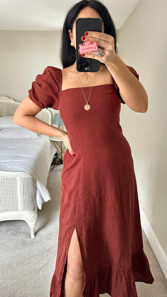 & other stories brown burgundy pure linen side split holiday event dress medium UK 12 vgc