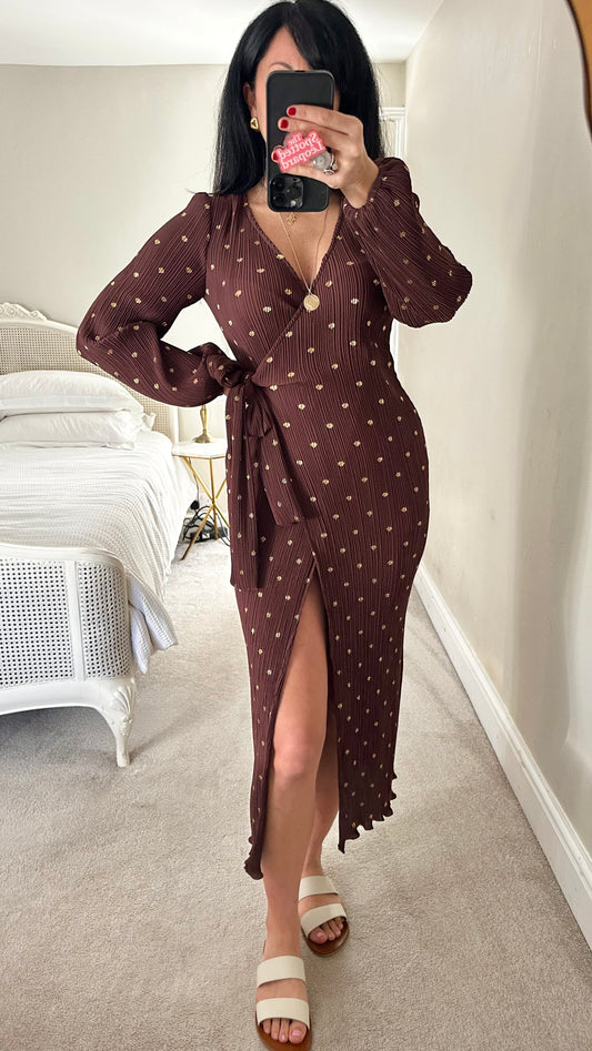 Never Fully Dressed brown gold polka dot plissé midi wrap dress extra small UK 6-8 vgc