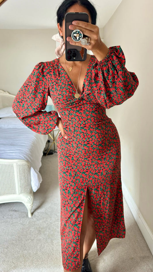 Topshop red rose balloon sleeve backless event dress extra large UK 12 14 vgc w25