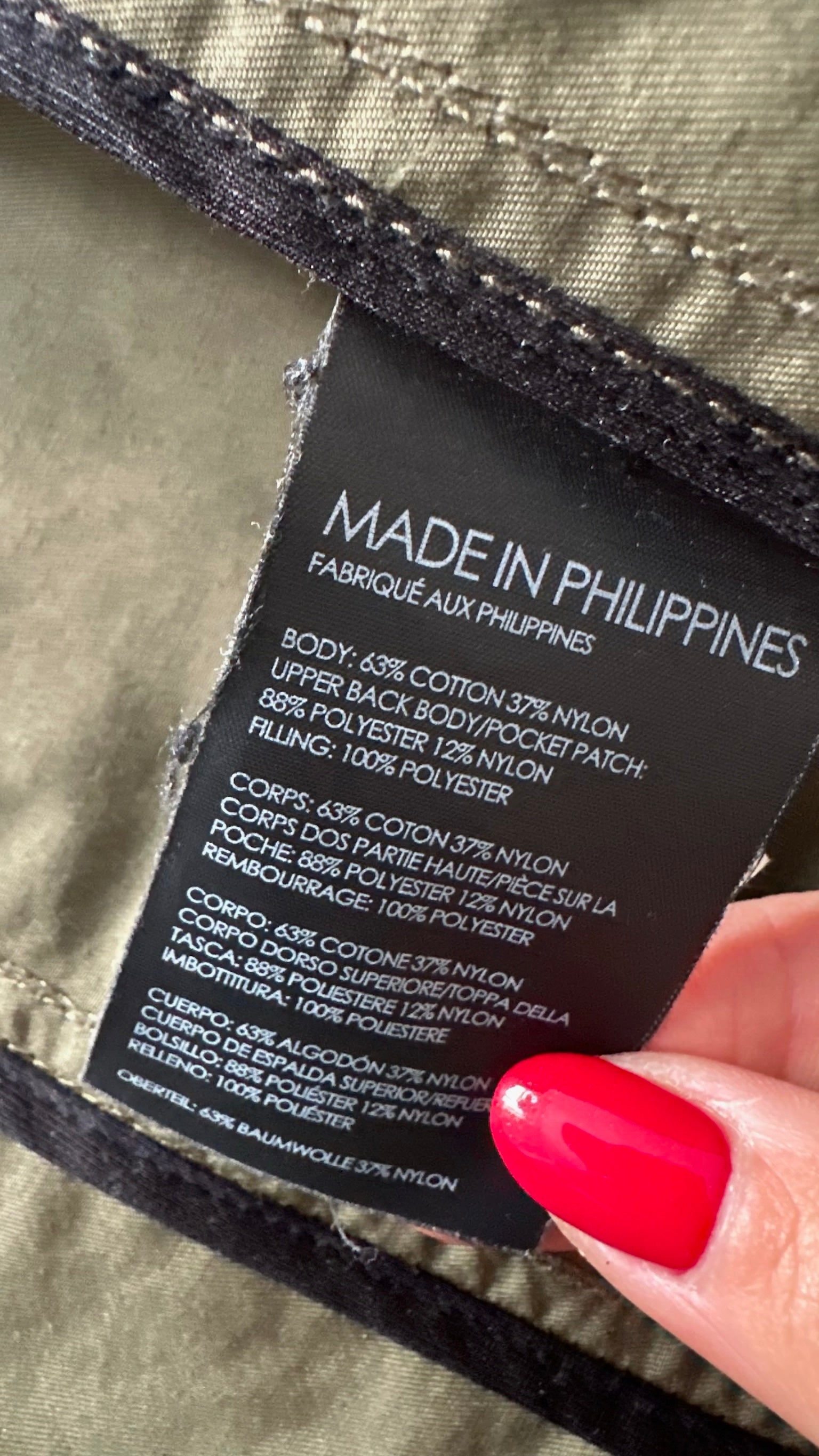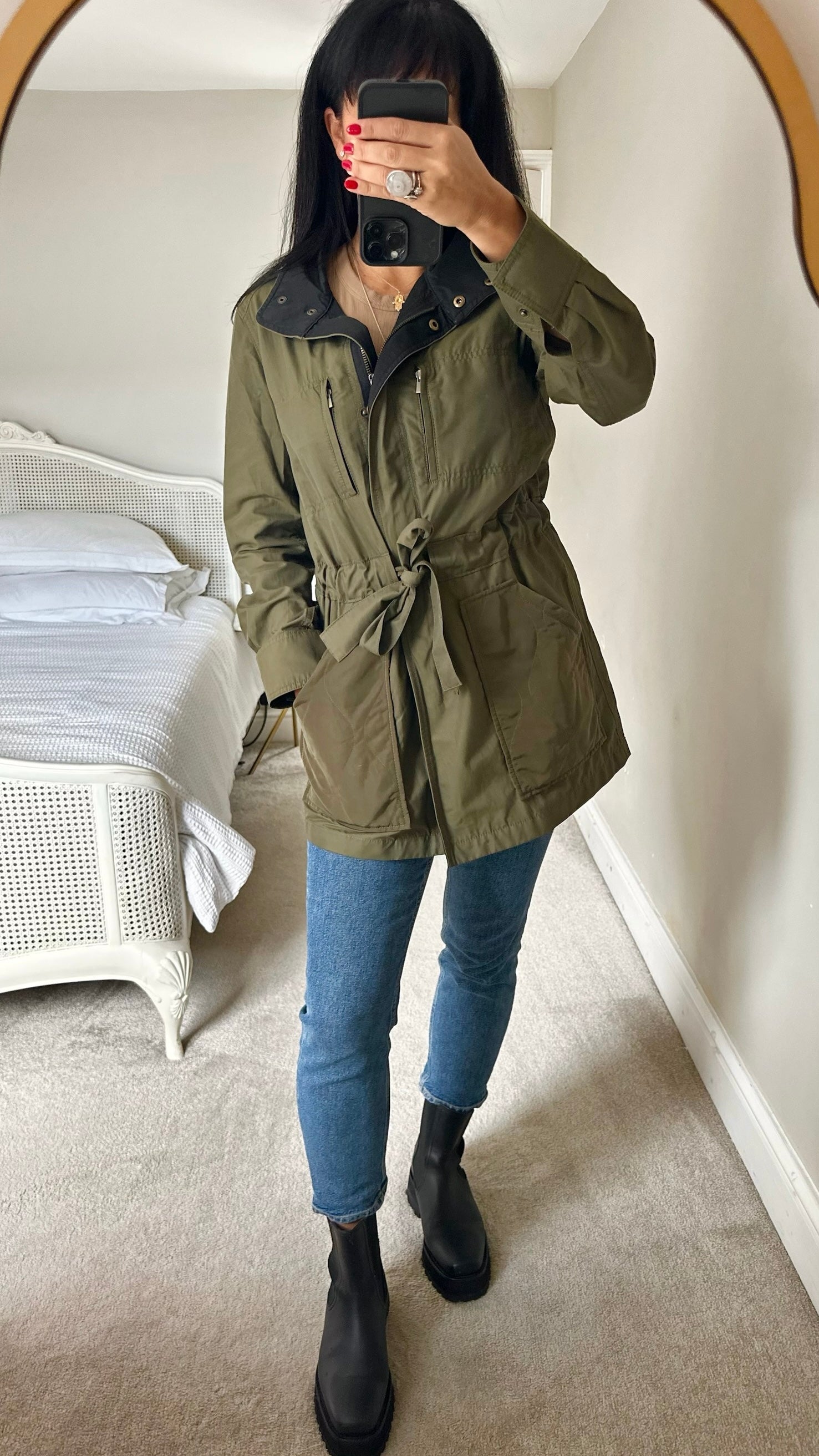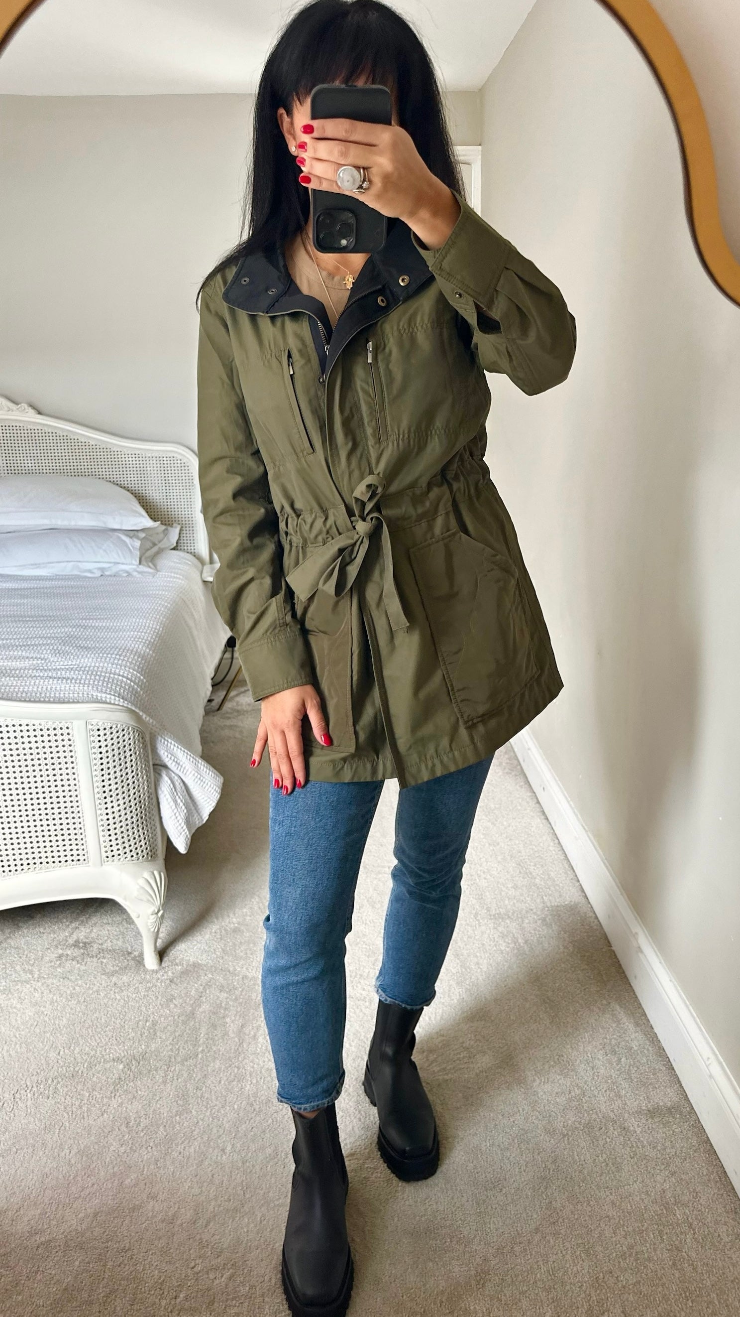 Club Monaco khaki olive green waxy look tie waist jacket medium M UK 12 excellent used condition