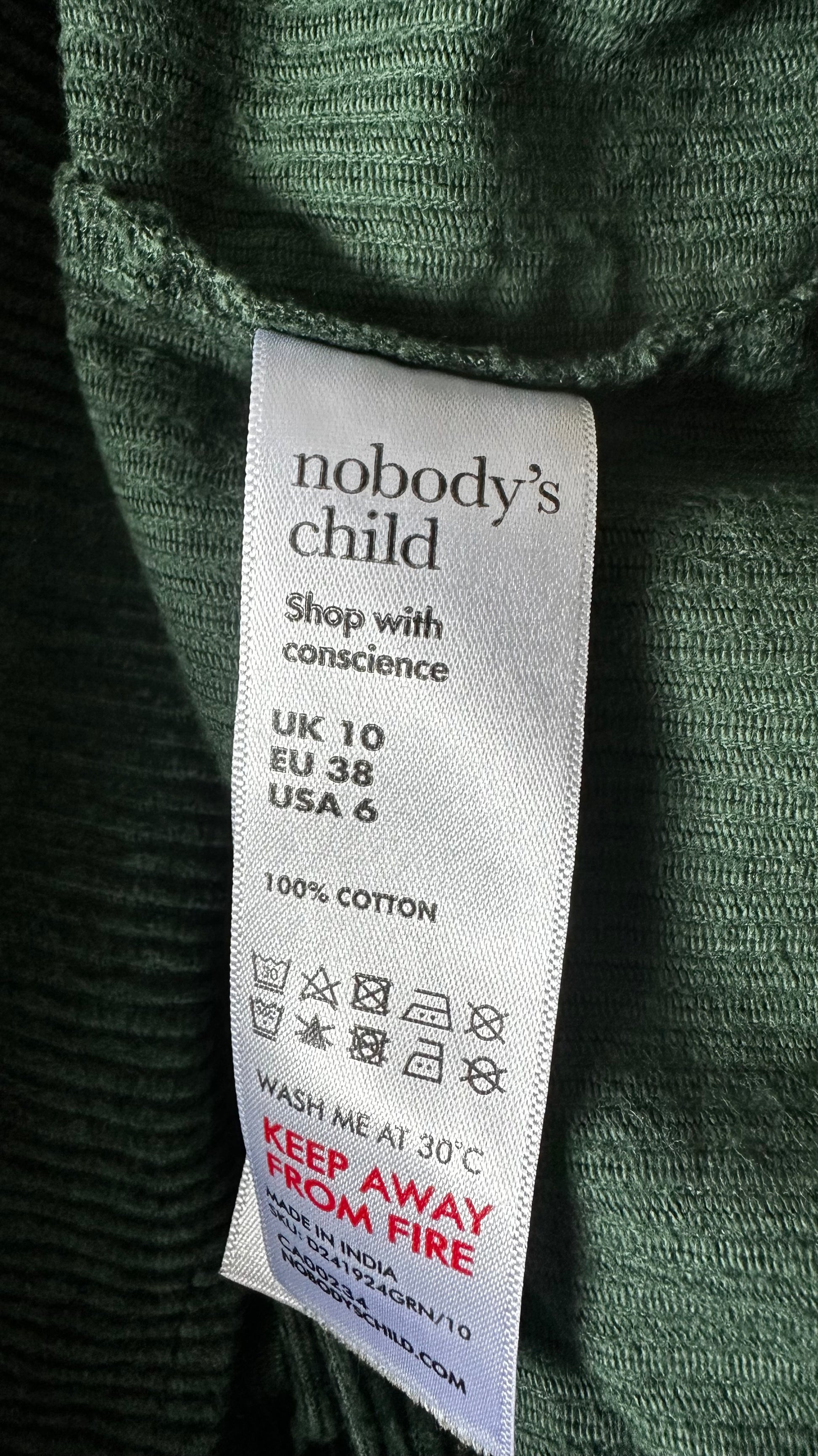 Nobody’s Child forest green corduroy mini button up dress small UK 10 vgc