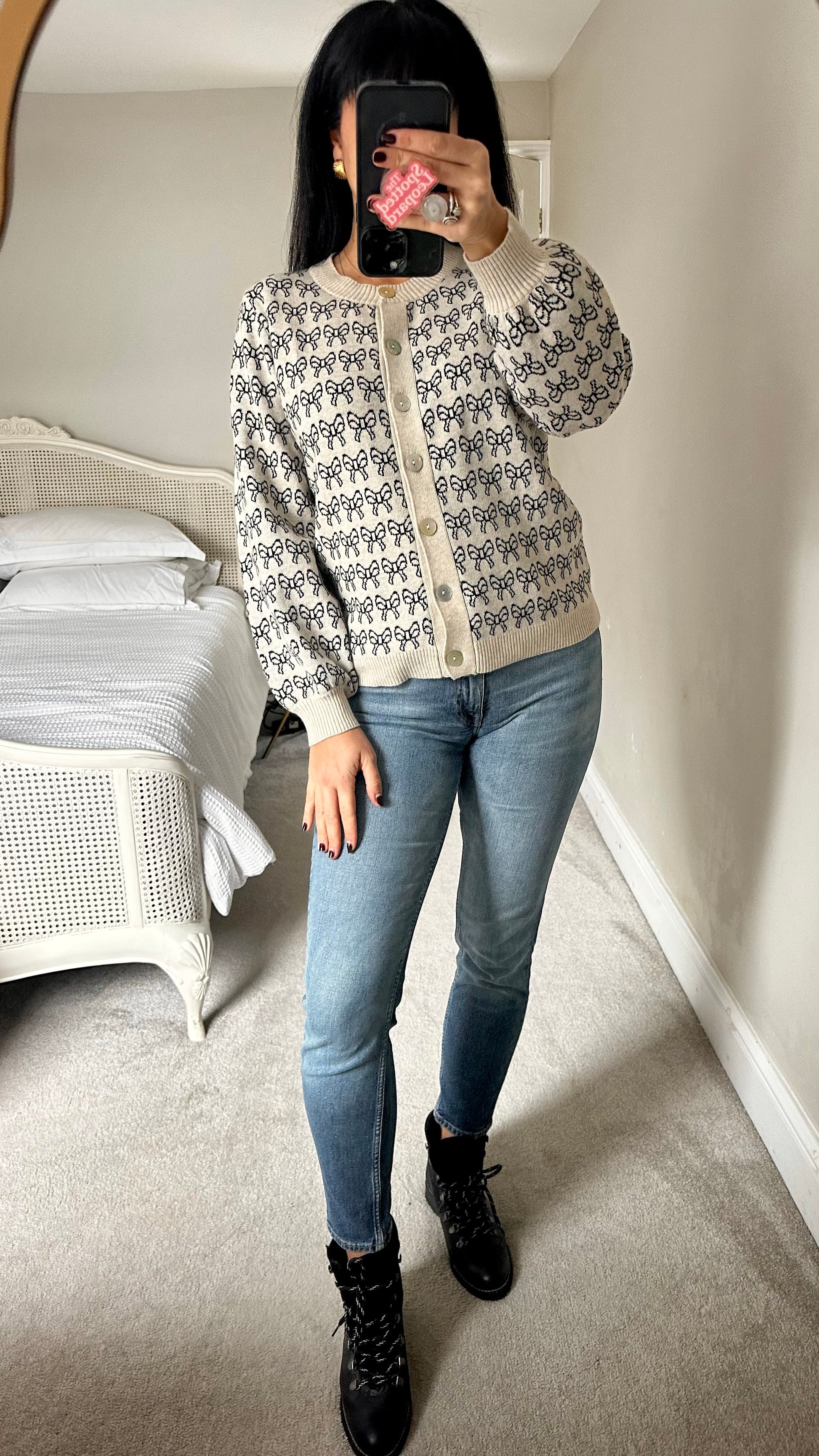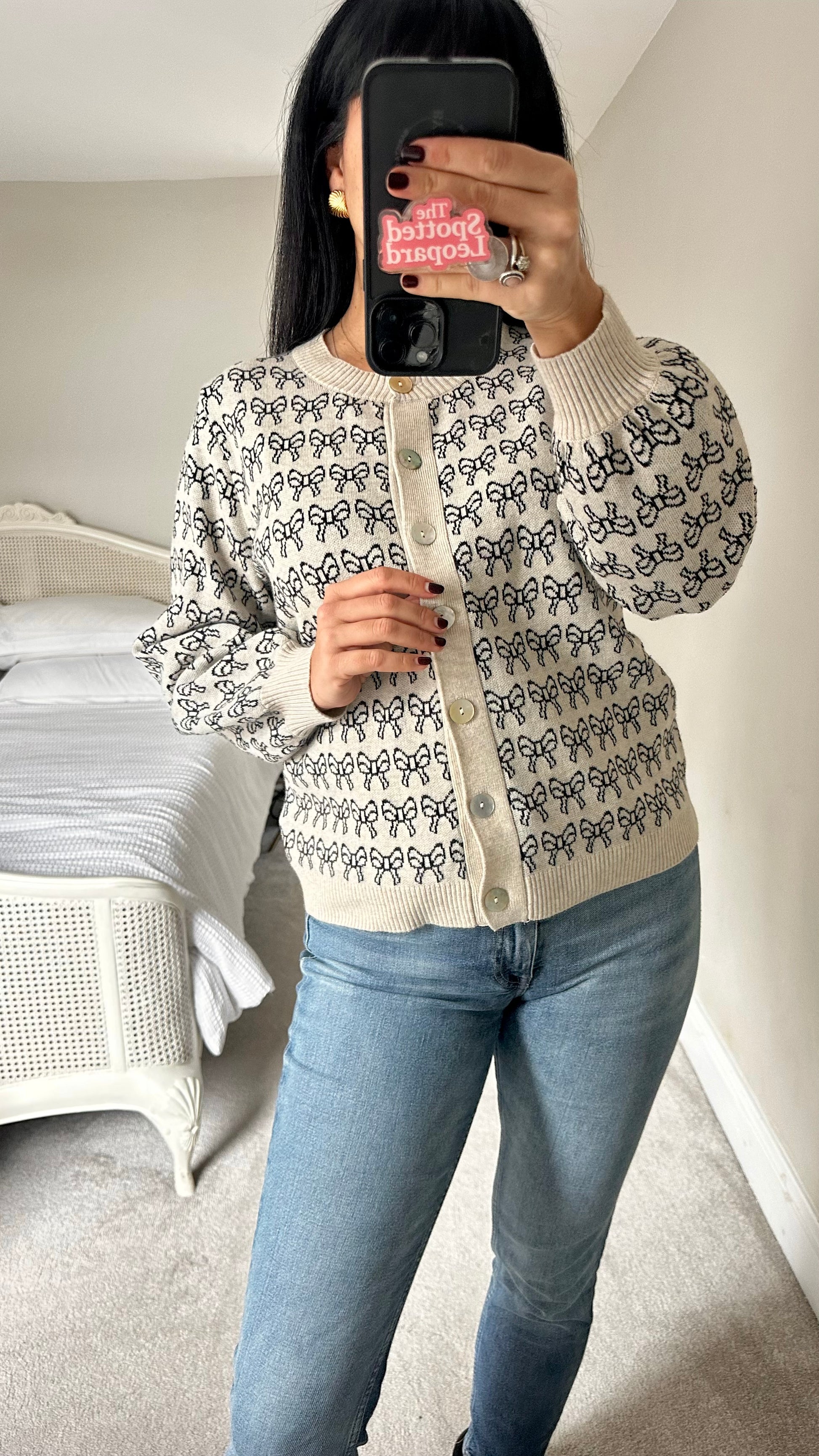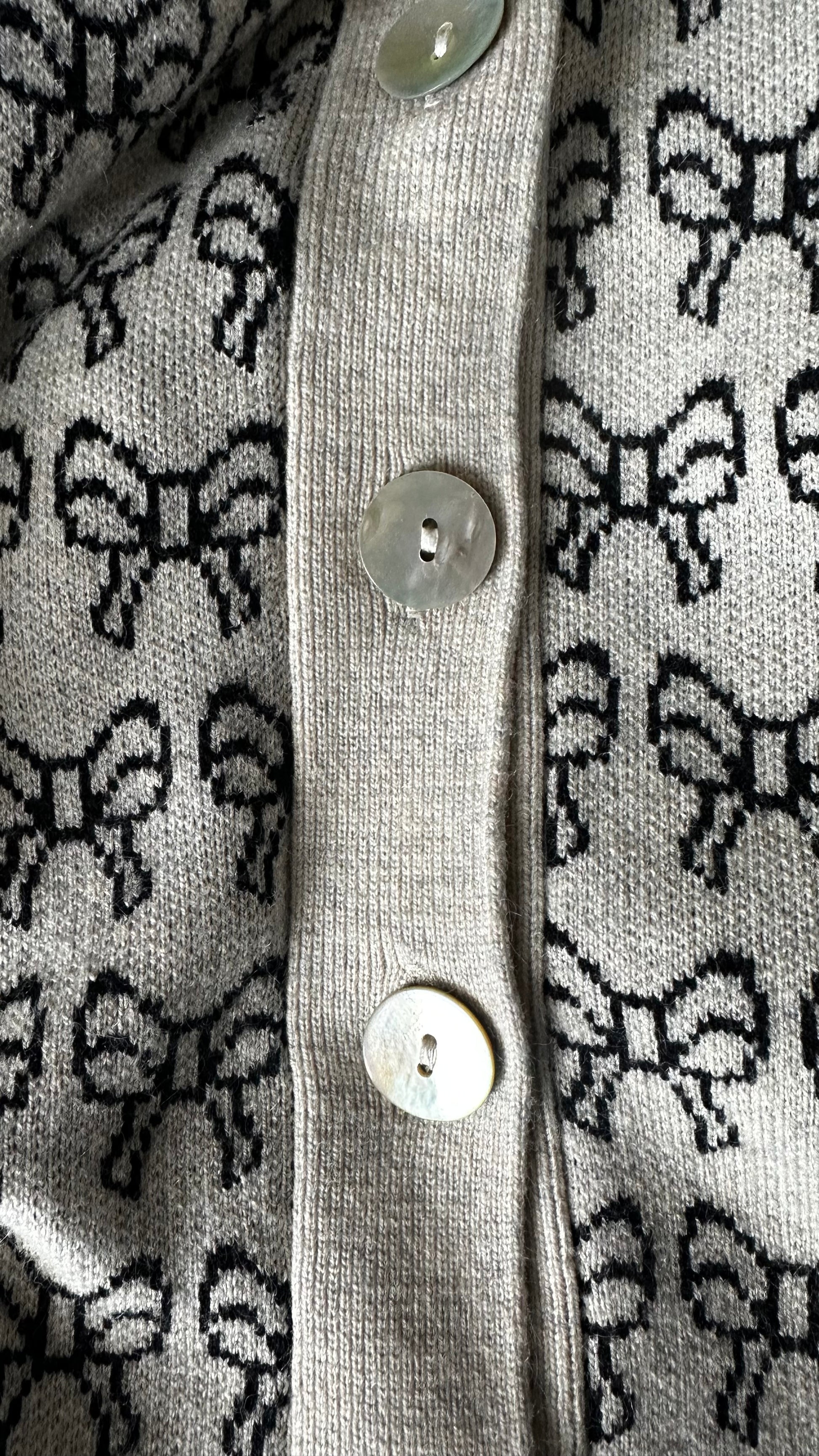 ICHI stone black ribbon bow print jumper cardigan medium UK 12 vgc