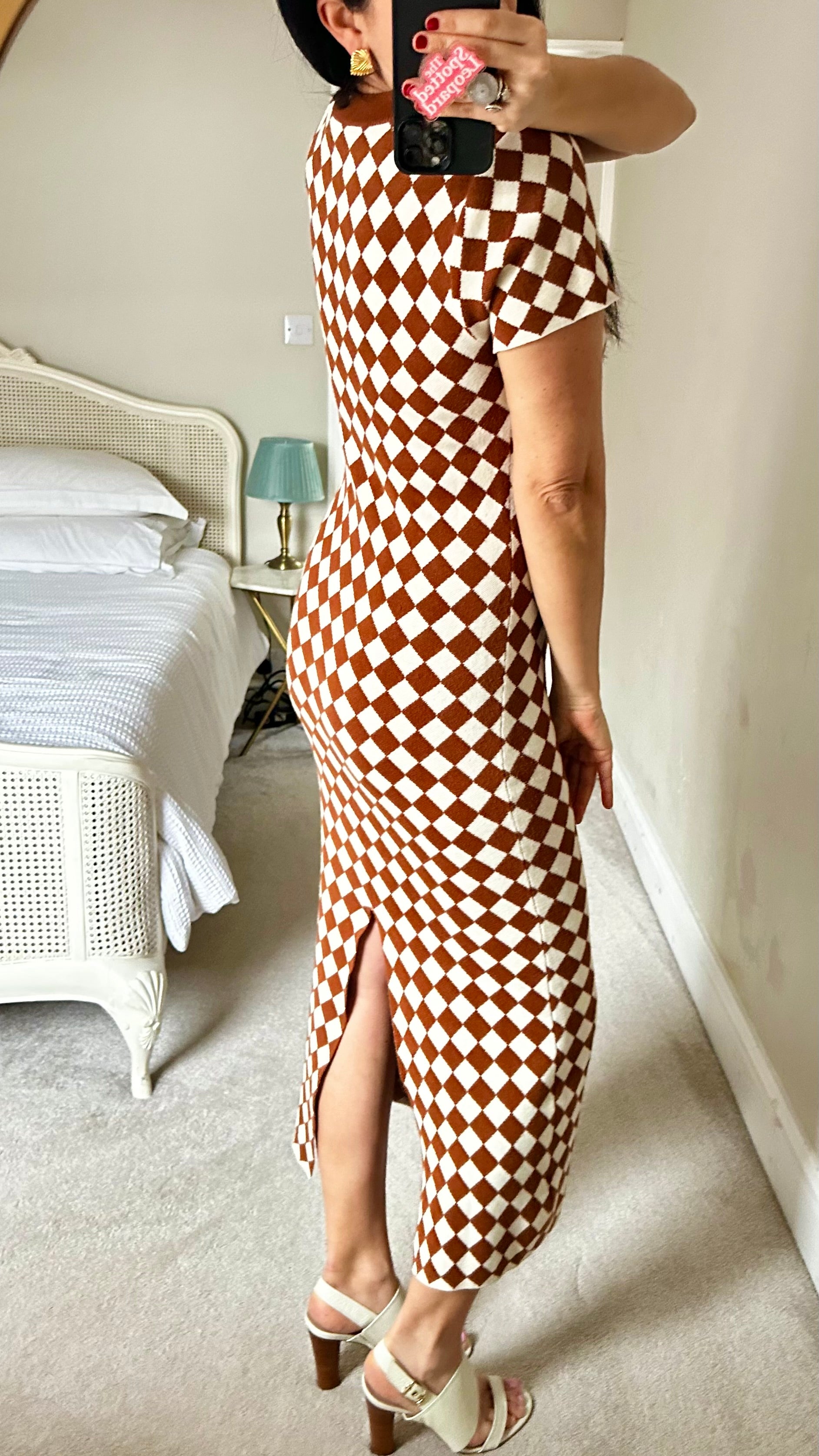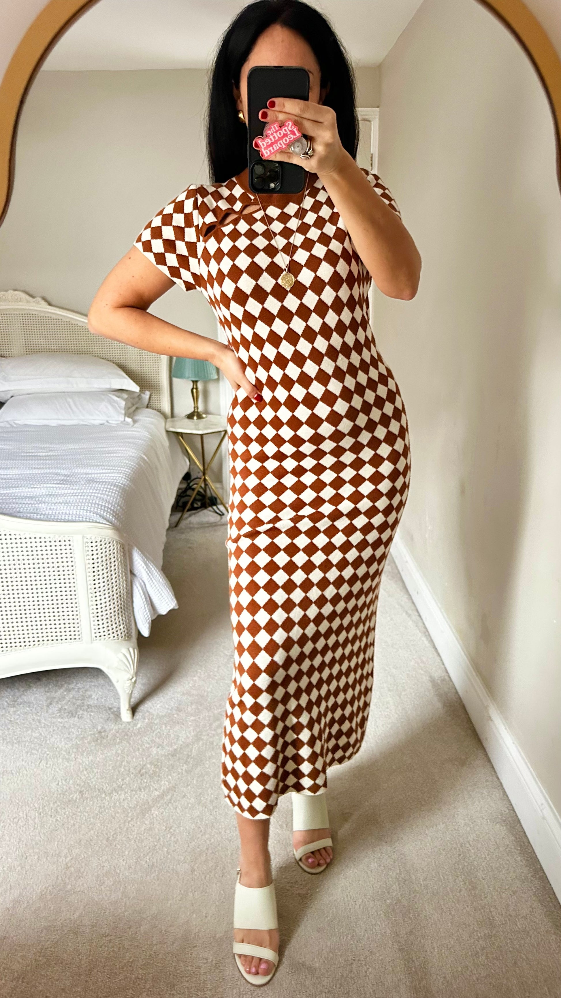 Kitri brown cream checkered midi long dress event large UK 14 vgc