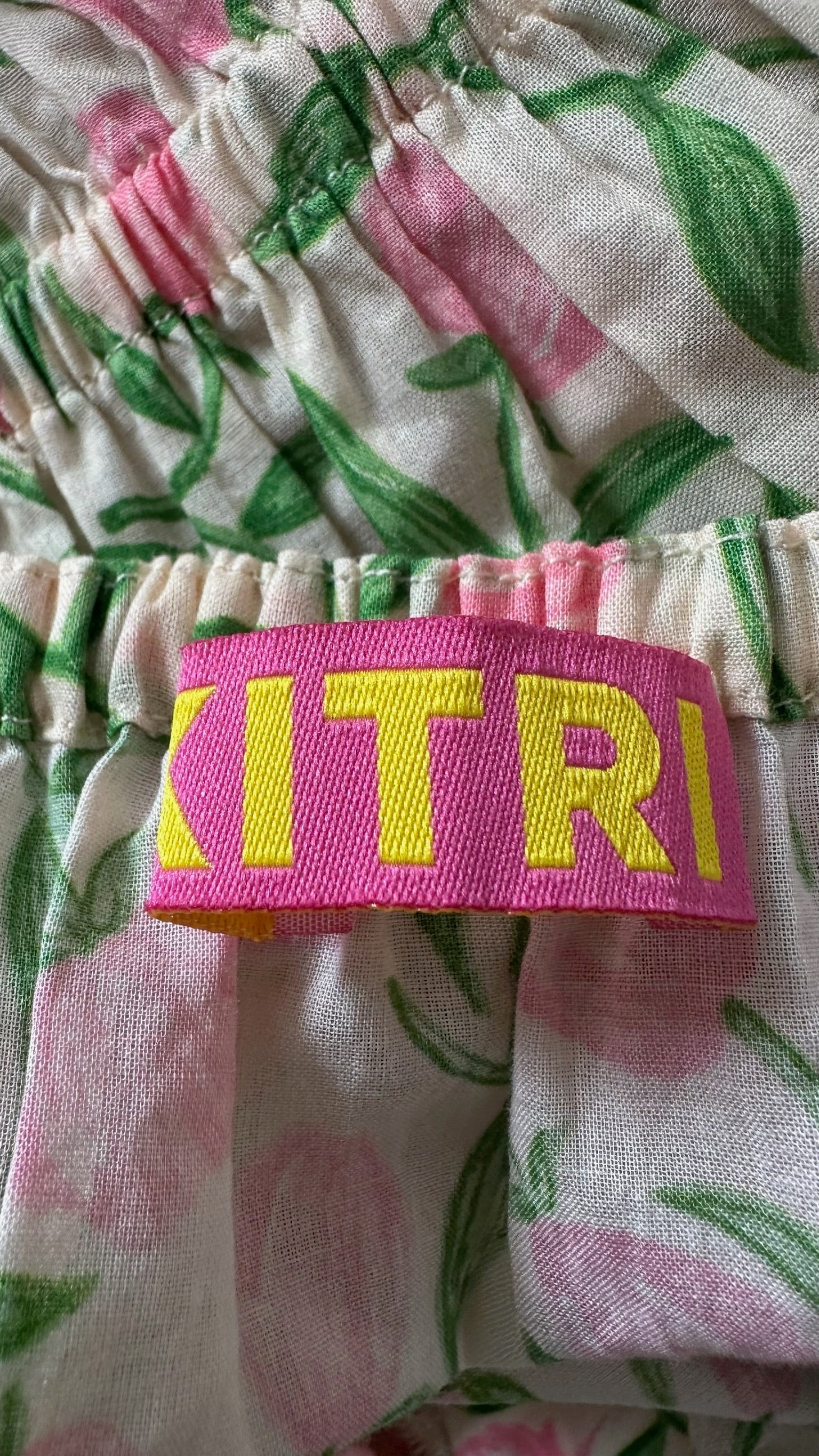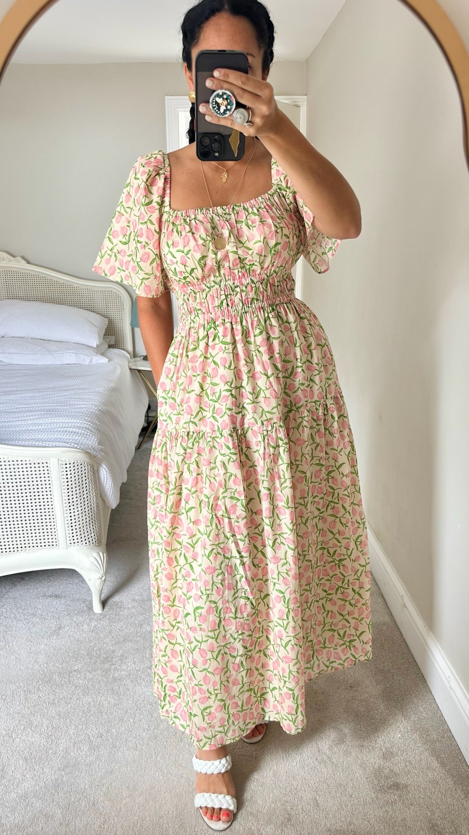 Kitri pink green peony peaches cotton midi long dress holiday event medium UK 12