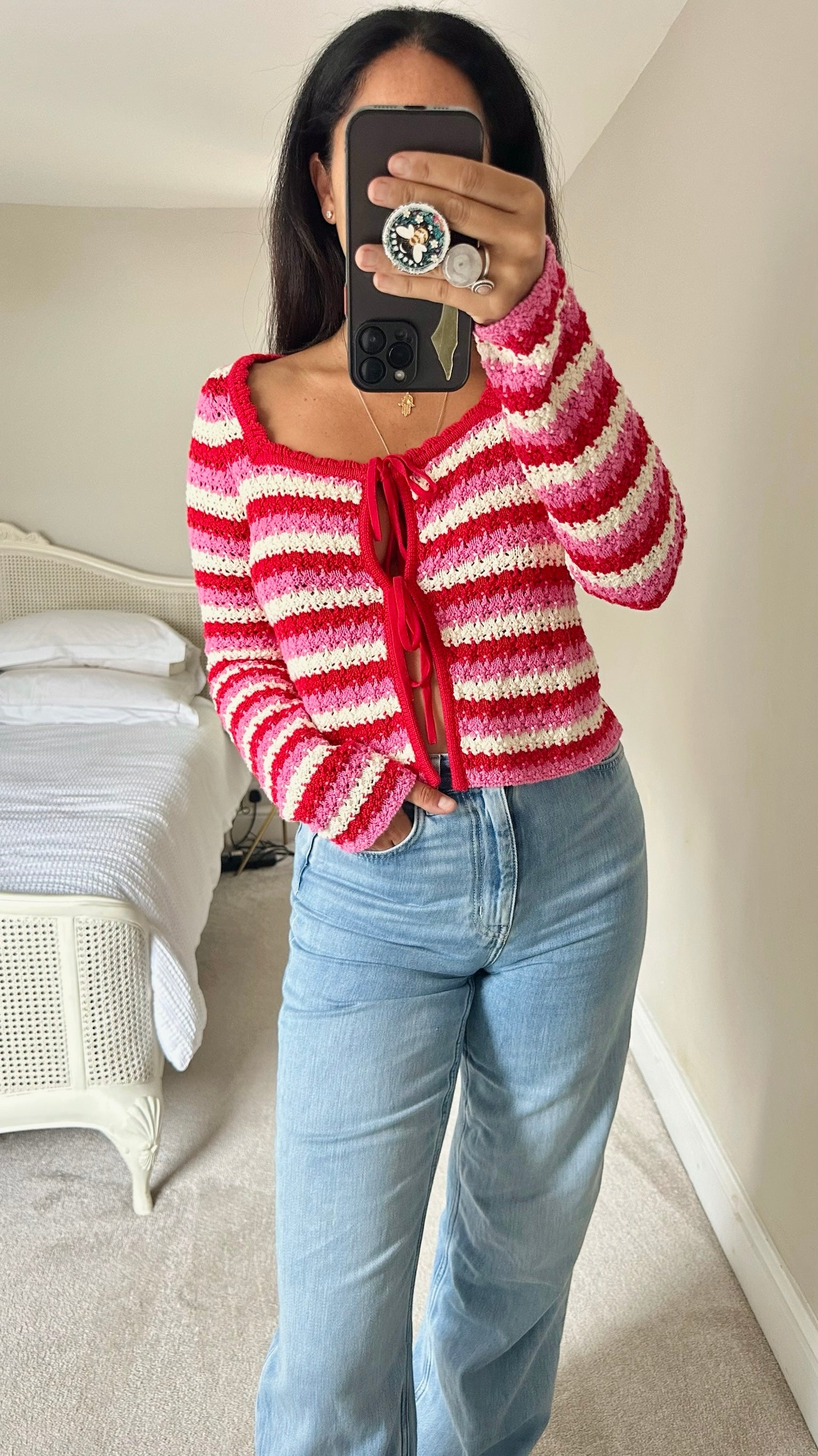 Kitri red pink cream crochet knit cardigan jumper as new condition W25