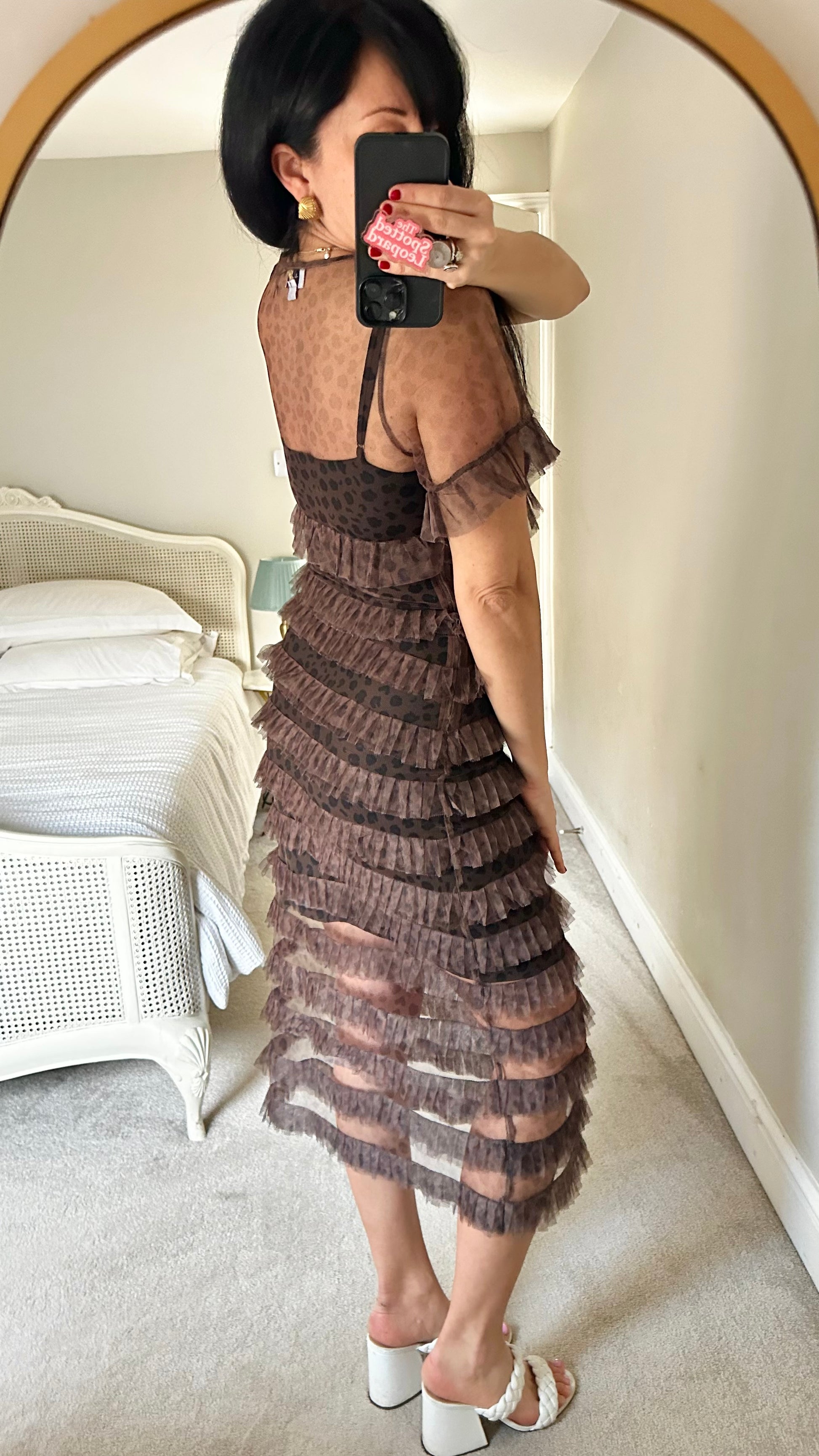Never fully dressed brown black leopard print frill midi long dress small UK 10 vgc