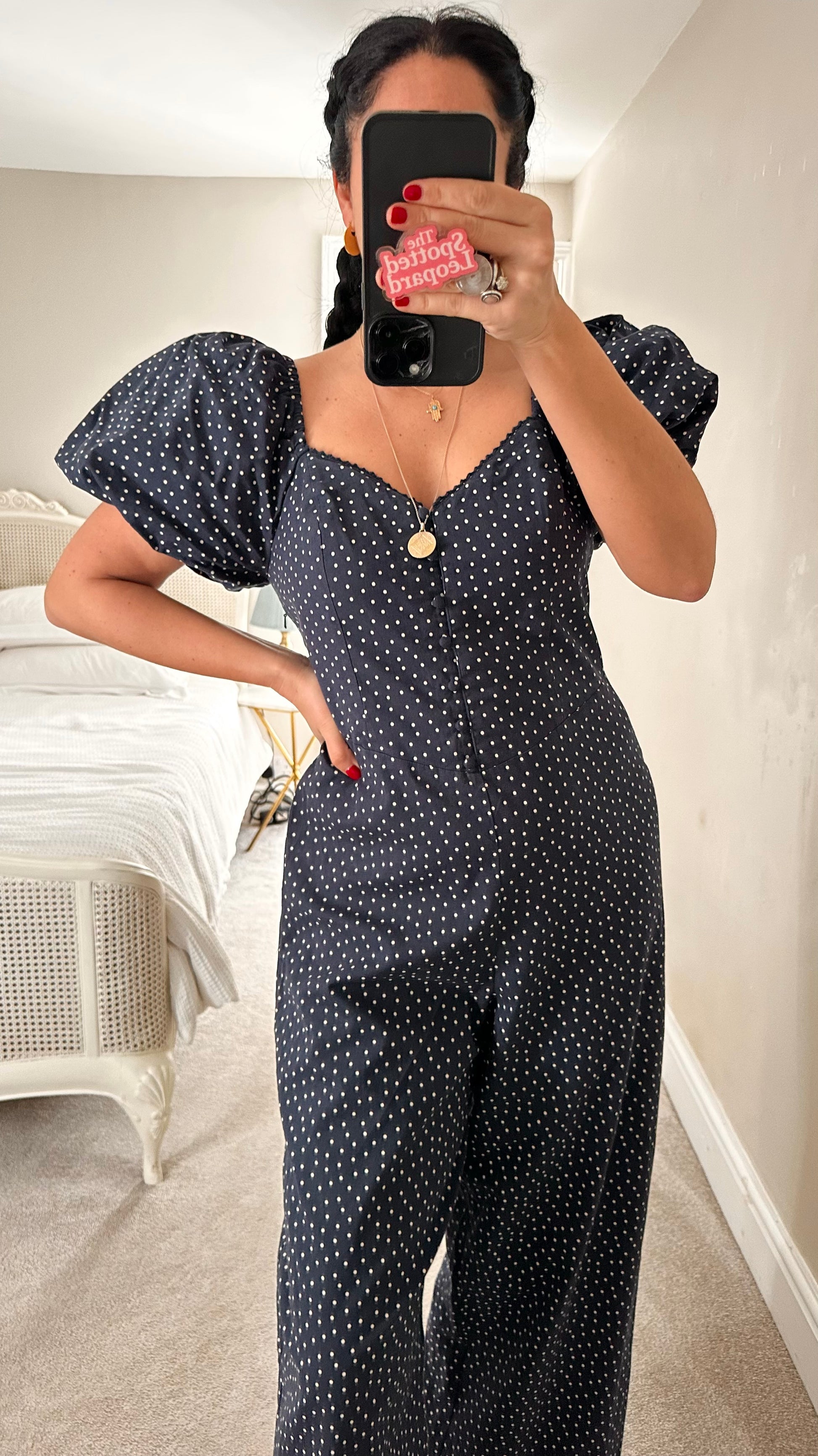 Nobody’s Child navy blue cream polka dot linen blend jumpsuit trousersuit medium UK 12 vgc