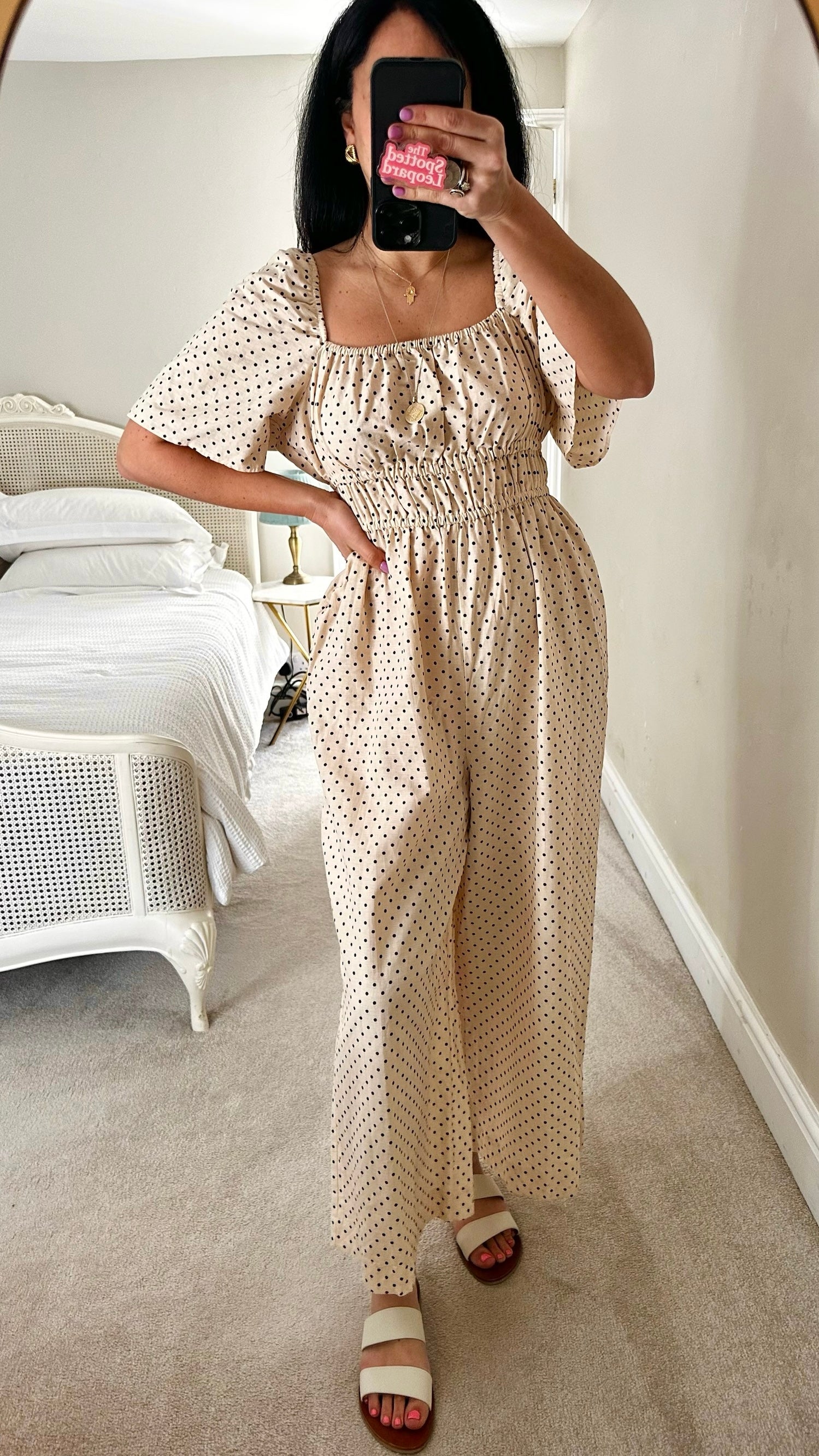 Gorgeous linen blend cream and black polka dot jumpsuit in excellent used condition ❤️ Shoes also listed ❤️