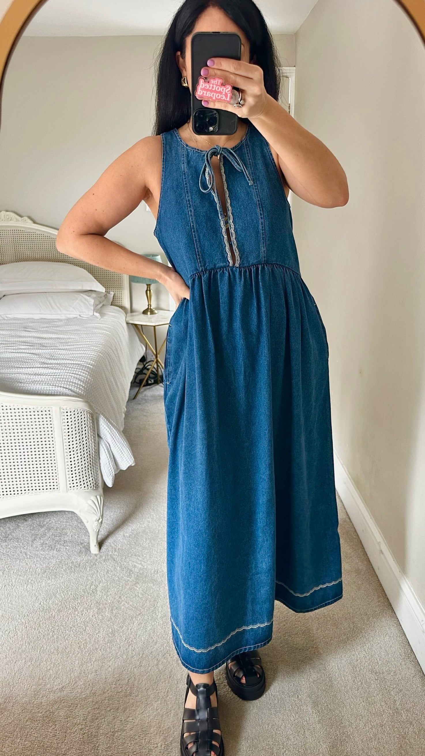 ❤️ Beautiful navy blue denim maxi dress in as new condition. Cut large and best suited to UK 10-12. Also suitable for breastfeeding ❤️ Shoes also listed ❤️