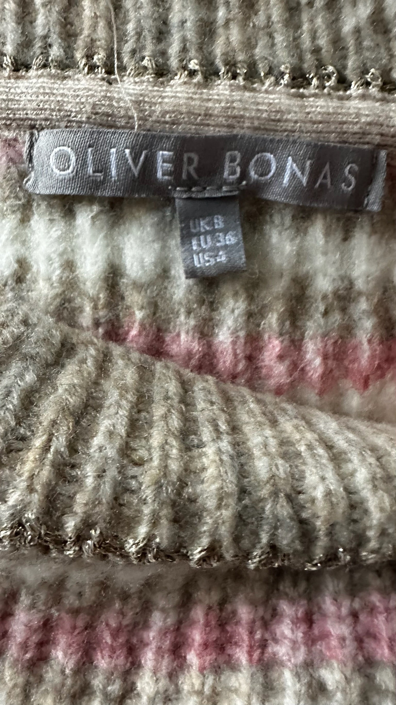 Oliver bonas pink cream white stripe shimmer knitted jumper small UK 8-10 vgc