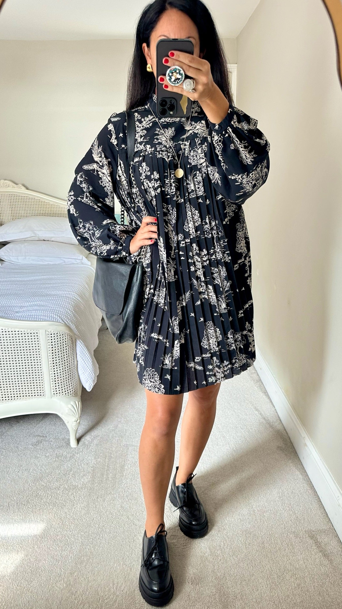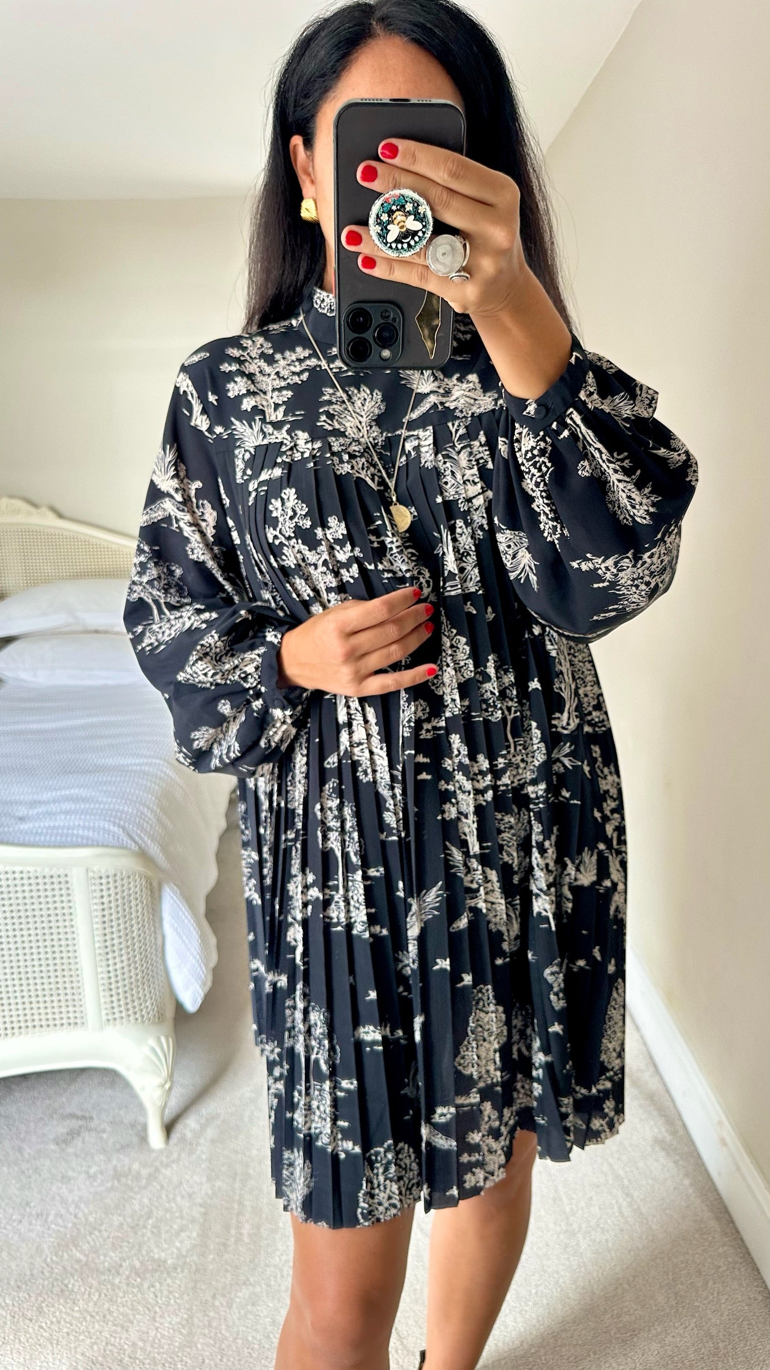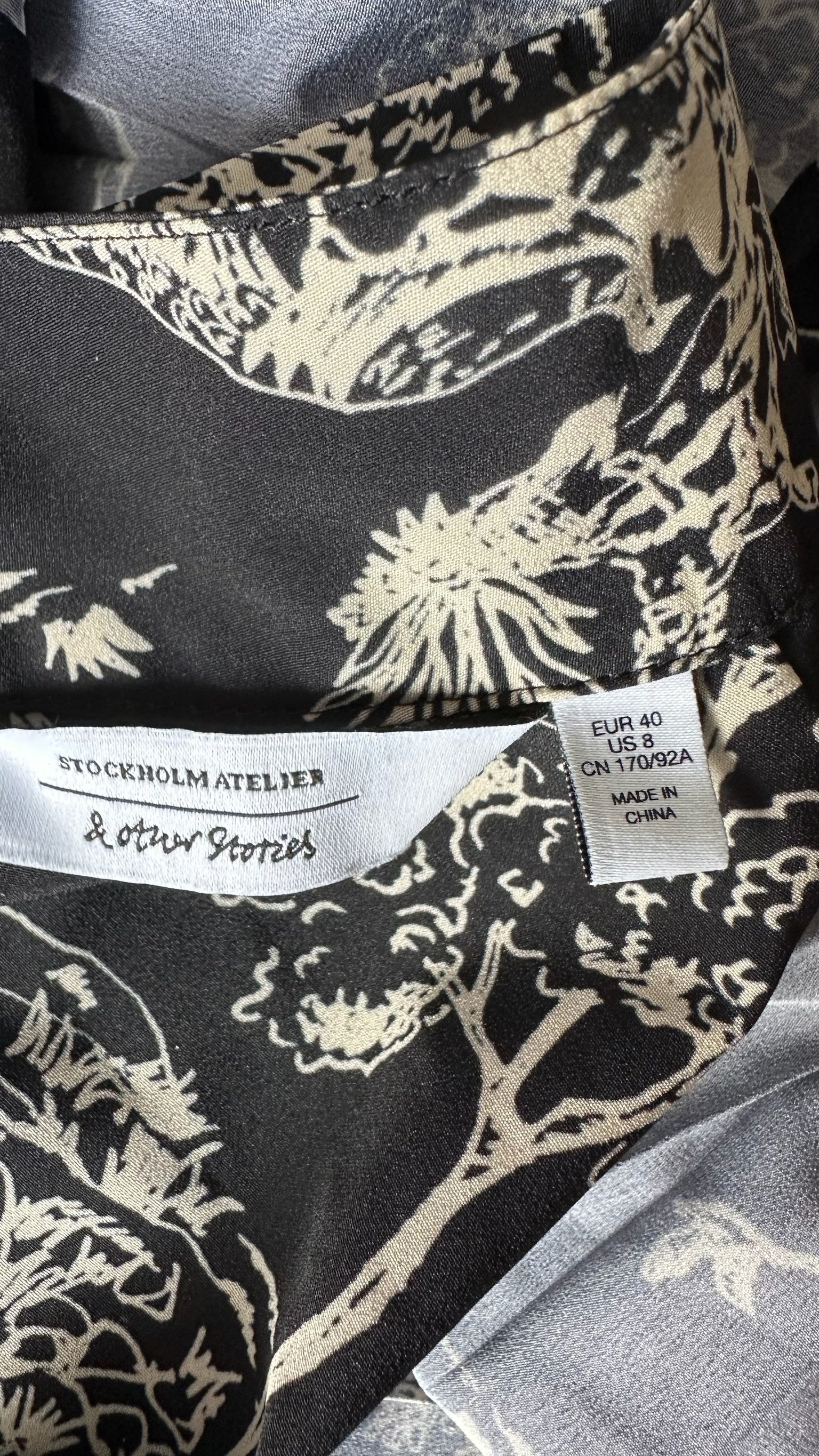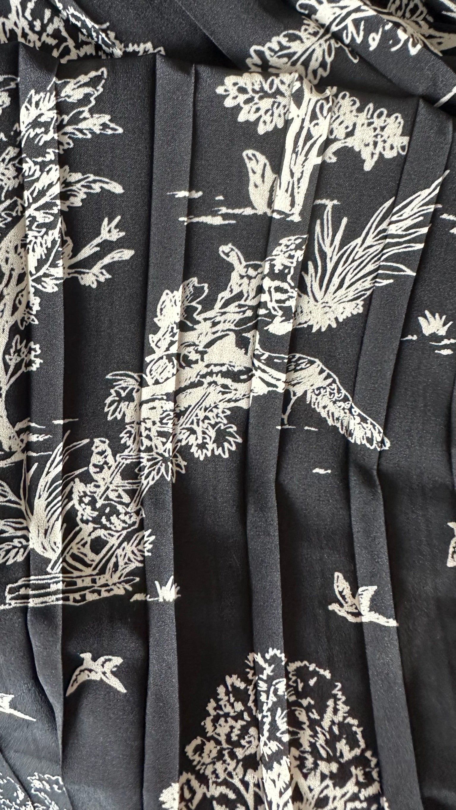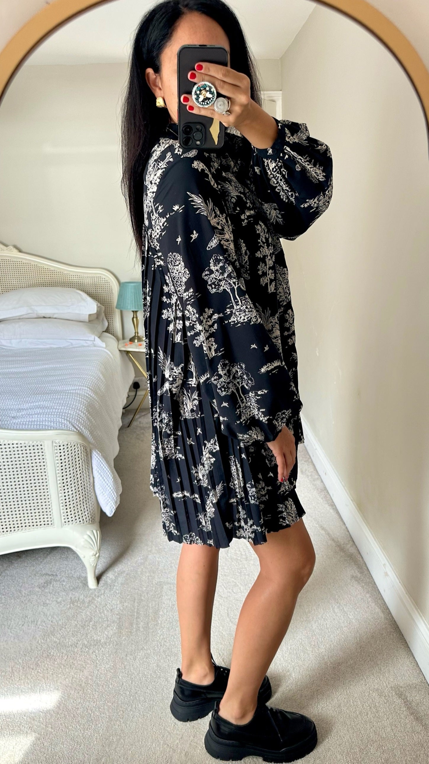 & other stories black cream peacock village print pleated mini smock dress large UK 12 vgc w25