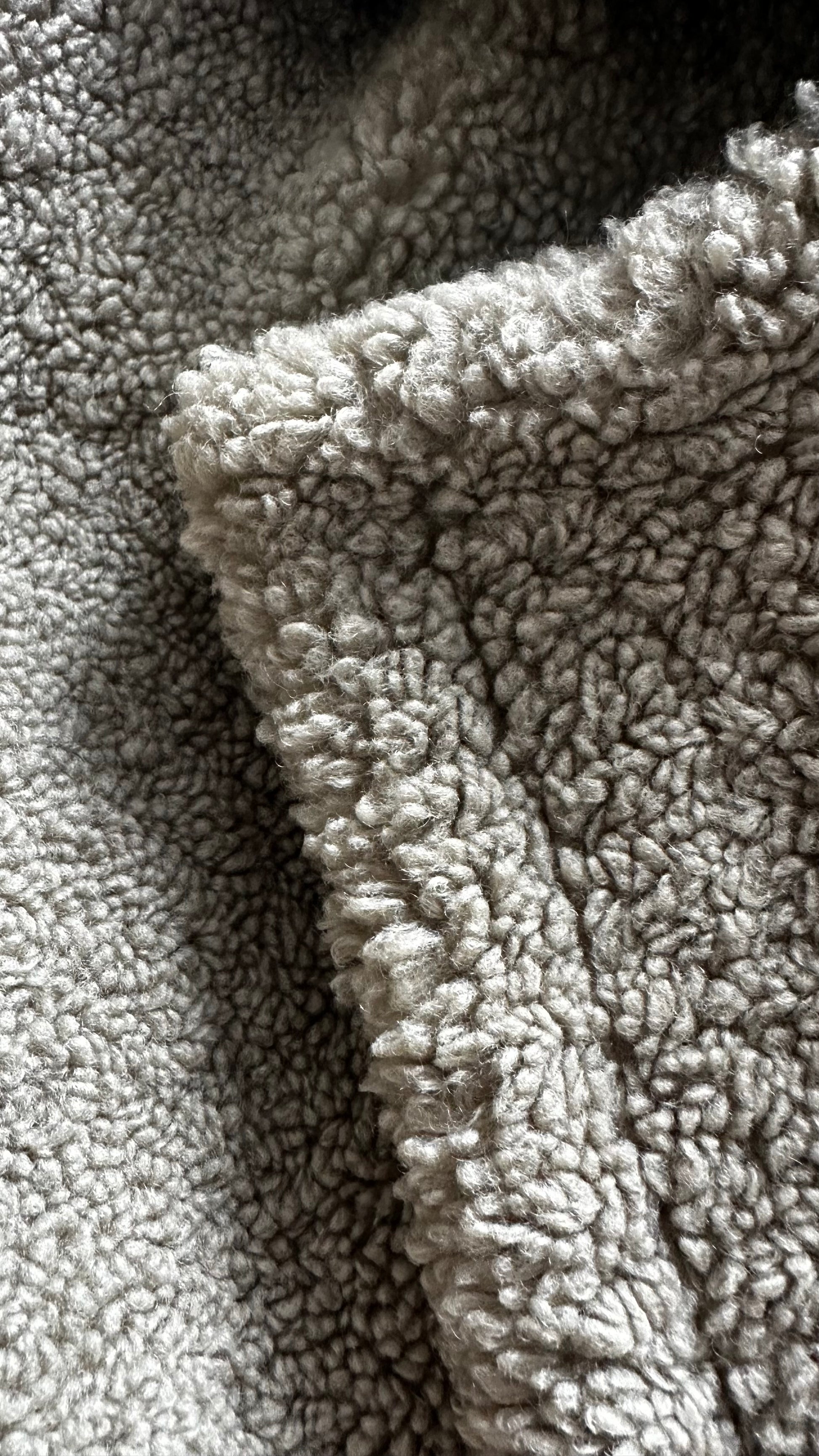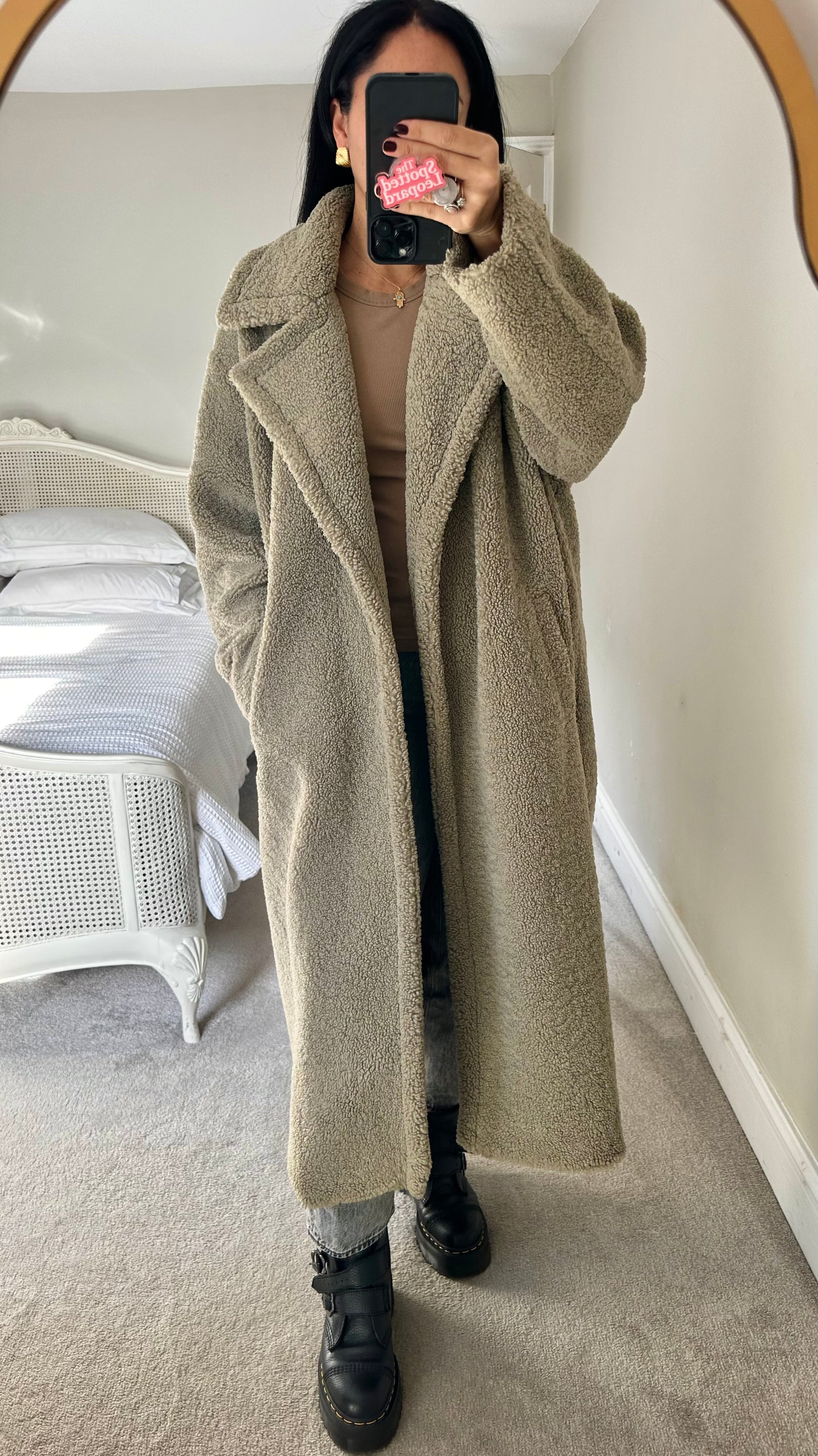 Pretty Lavish khaki beige stone teddy long maxi coat large UK 12 14 16 vgc