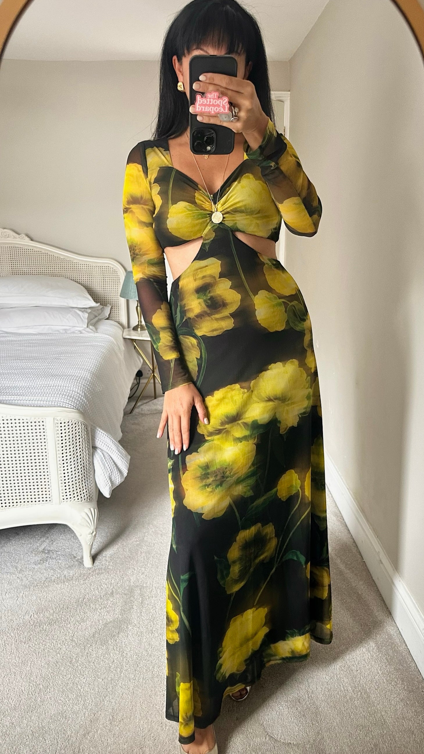 Topshop black acid yellow floral cut out maxi event dress small S UK 8-10 excellent used condition