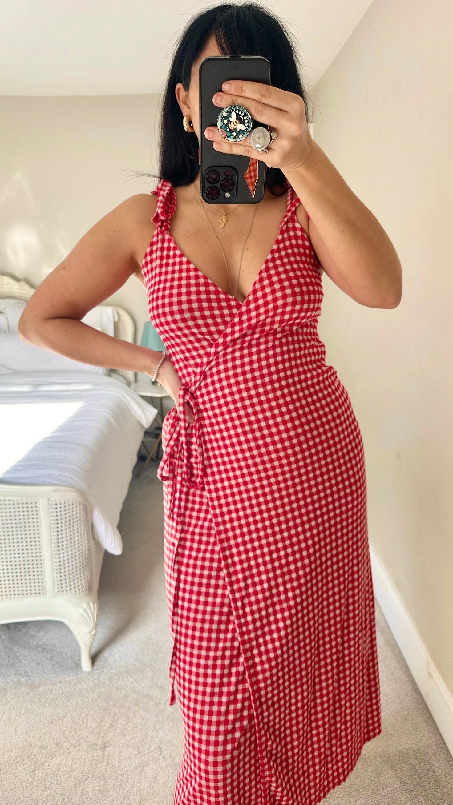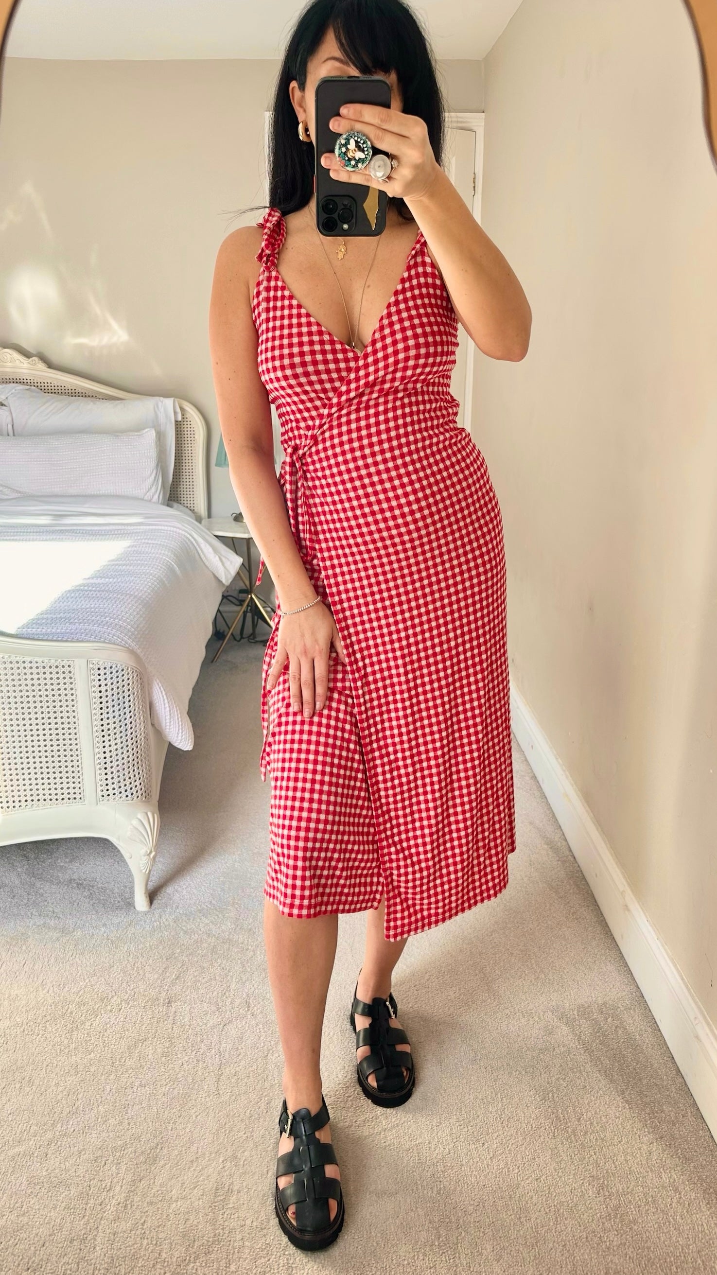 & other stories red white gingham check wrap midi long dress UK 8 10 14 vgc