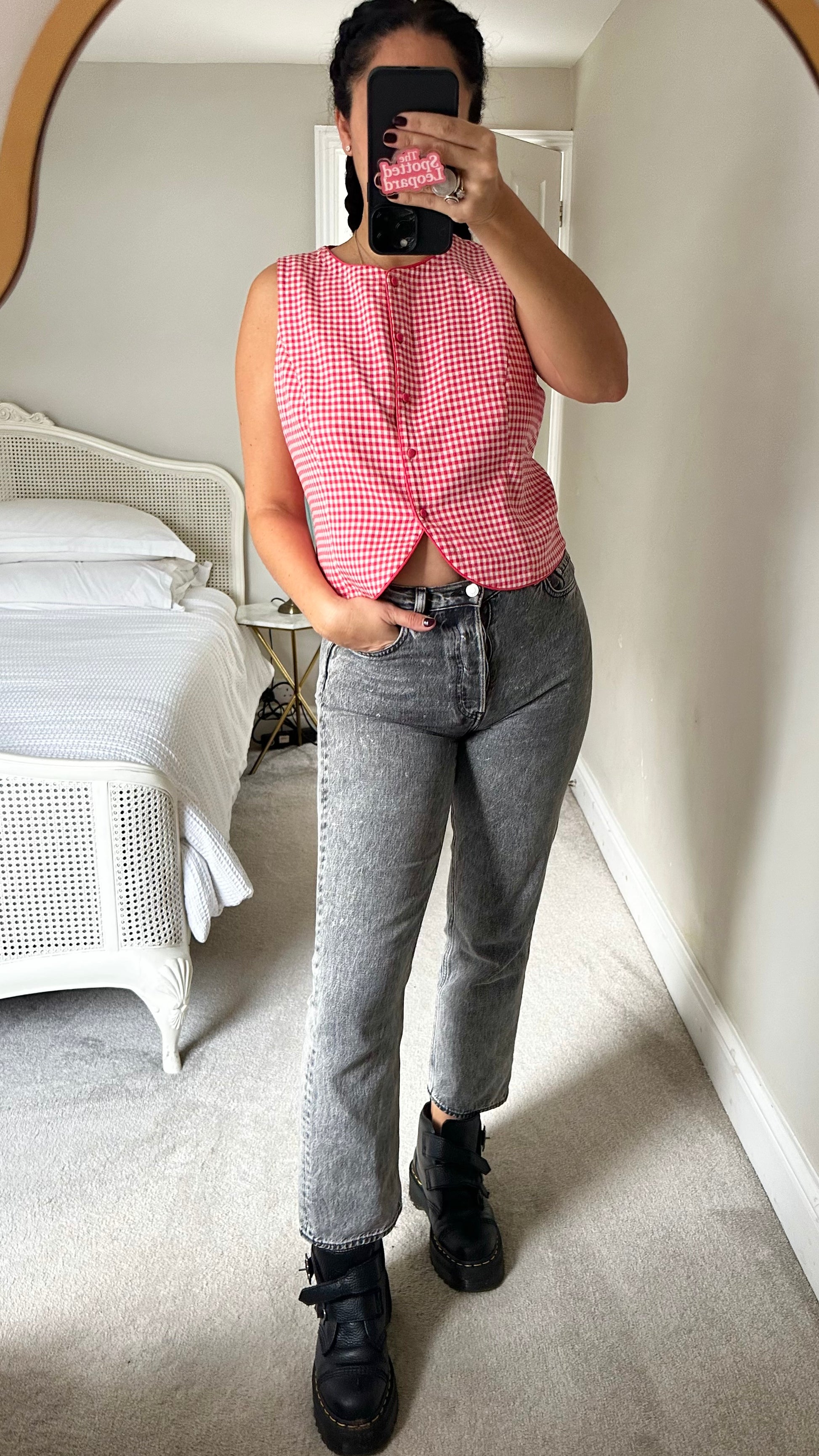 Oliver Bonas red white gingham check waistcoat top button up small medium UK 10 vgc