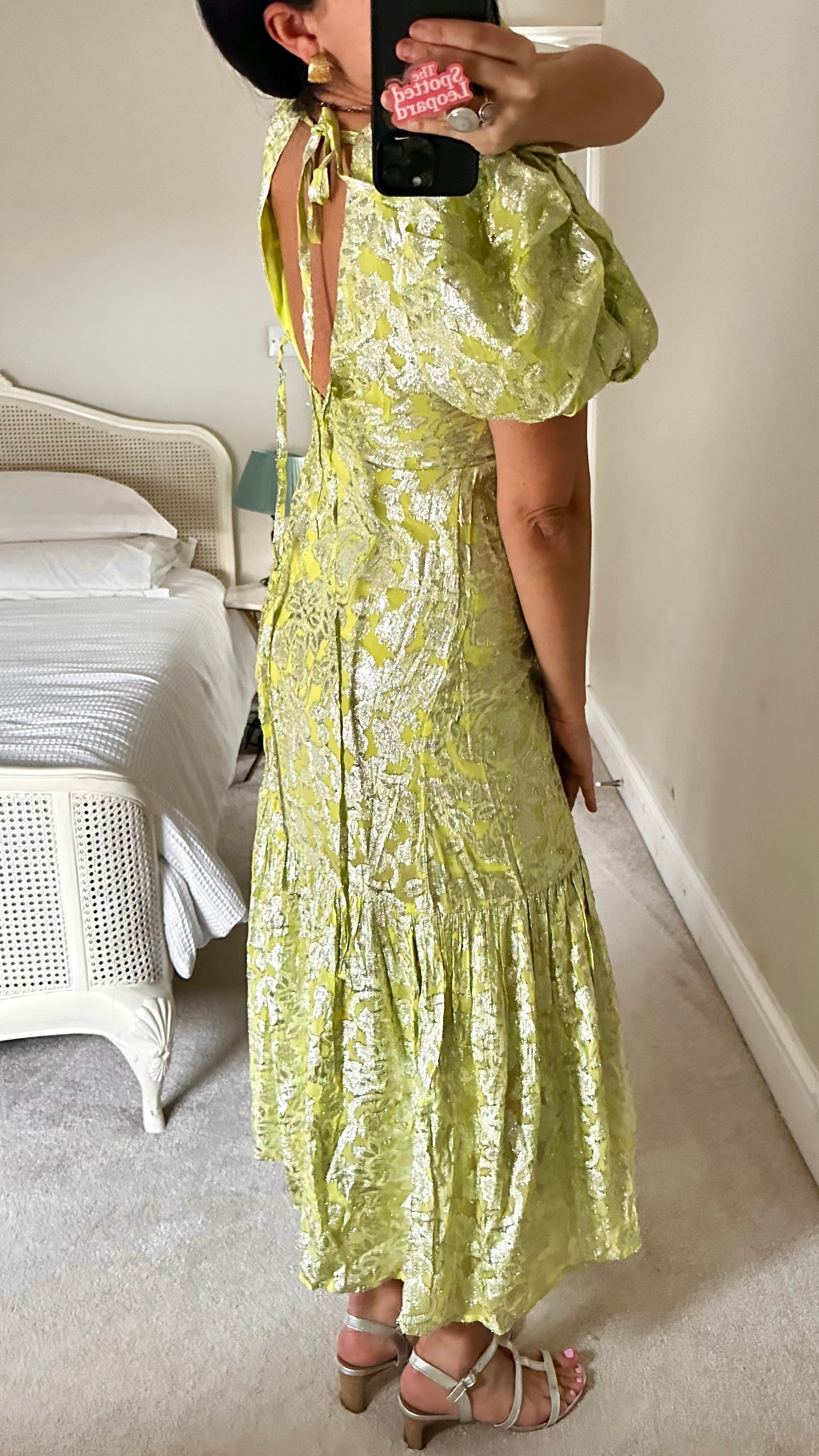 Warehouse lime green silver metallic wedding guest long maxi dress small UK 10 vgc