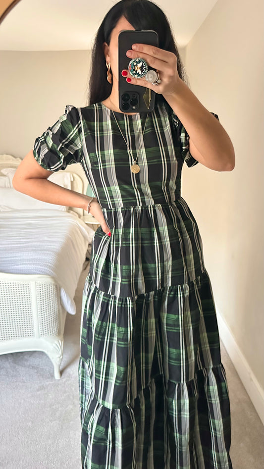 Topshop black white green tartan gingham check tiered maxi dress medium UK 12 petite vgc