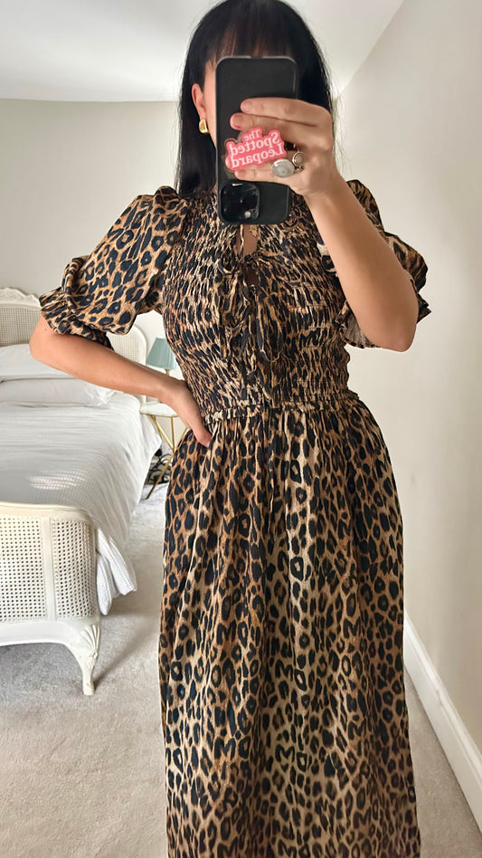 Damson Madder leopard print brown black animal tie front midi long dress small UK 10 vgc