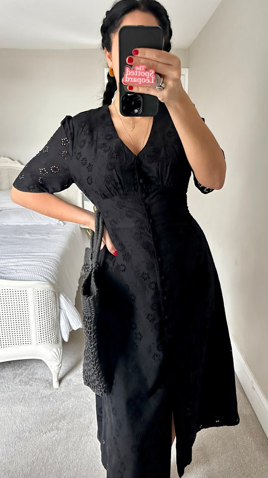 Nobody’s Child black button up broderie anglaise cotton dress medium UK 14 vgc
