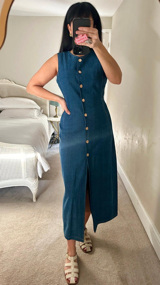 Ghospell dark blue navy denim maxi long button up casual dress medium UK 12-14 vgc