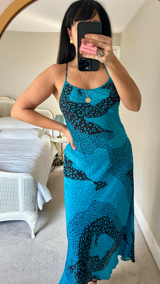 RIXO blue black turquoise animal print slip dress small UK 8-10 event vgc backless silk