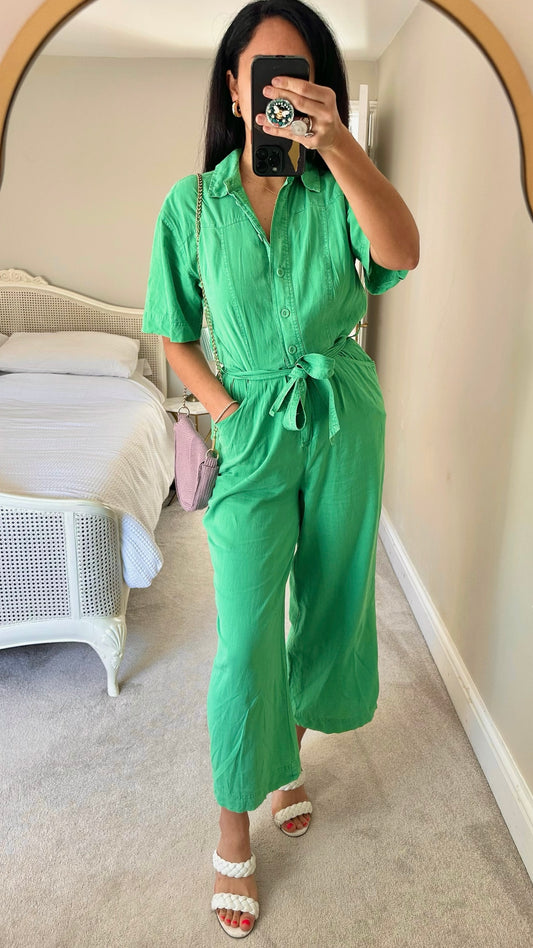 Oliver bonas green tie waist jumpsuit boilersuit medium S UK 8 vgc linen
